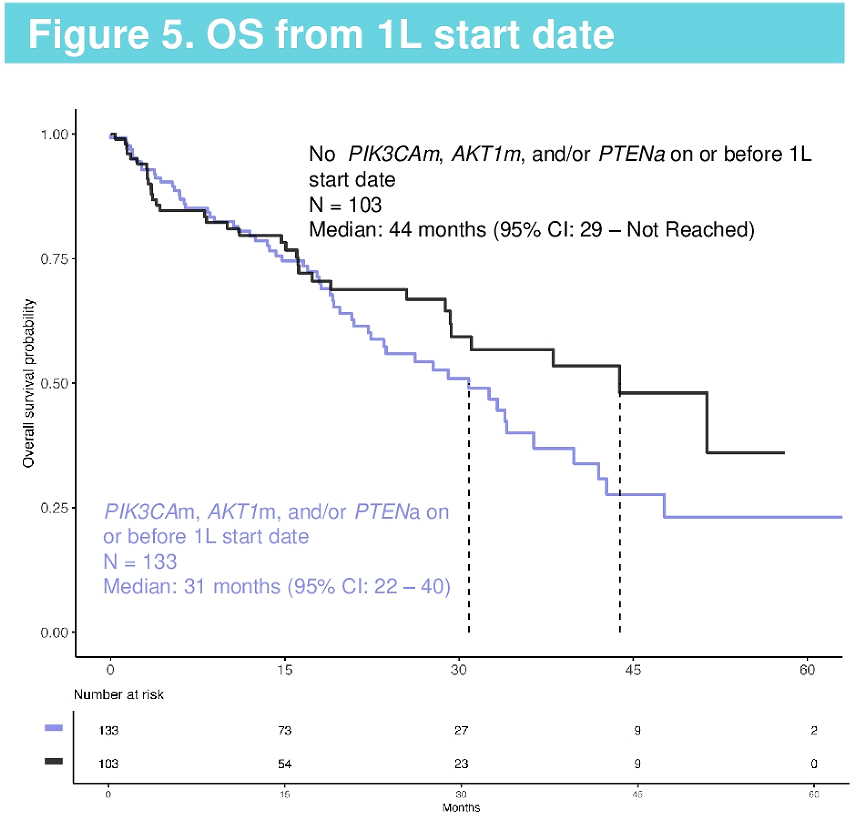 伴有≥1个PIK3CA、AKT1和/或PTEN变异的患者比不伴此类基因变异患者的自一线治疗开始的总体生存期(OS)短,mOS为31个月(95%CI:22-40)对比44个月(95%CI:29-未达到;图5)