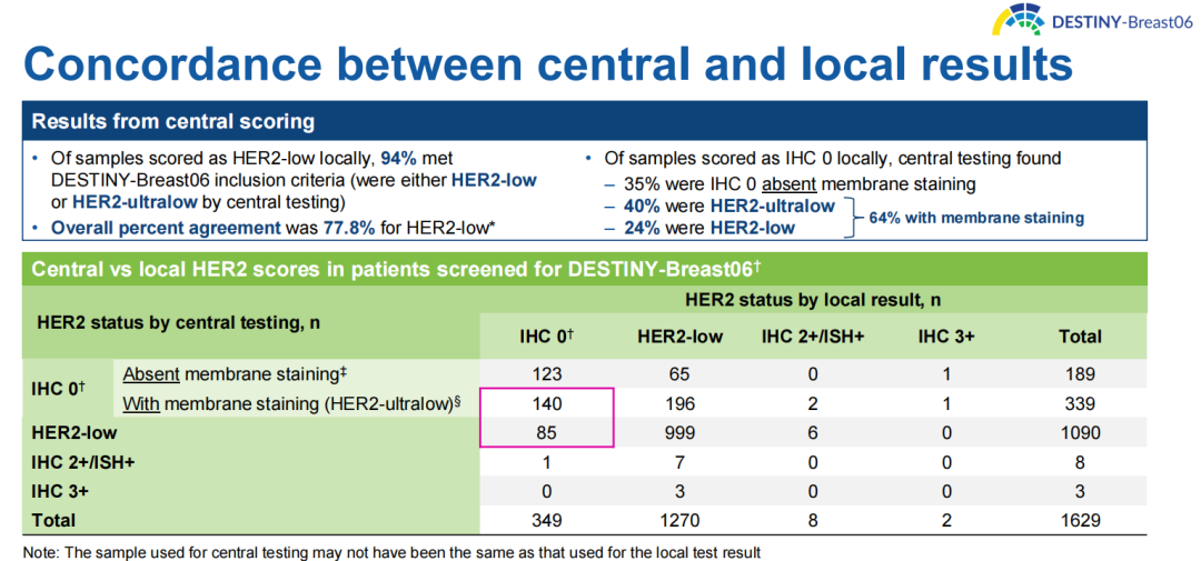 At the ESMO Congress,which just two weeks ago finished in Barcelona in Spain,we saw more updates on the DESTINY Breast-06 study.We saw data that there is quite good concordance,although not perfect,between different laboratories for the testing.So the recommendation is,if the patient has a HER2(0)finding in her tumor,that we always retest,because there may be a faint staining,either ultra-low,which is 10%or less tumor cell stains for HER2-low status.So in about 60%of the HER2(0)cases from local pathology,the central lab in the DESTINY Breast-06 study found actually HER2-low staining.And the other thing is that we saw some very interesting patient-reported outcomes showing that the quality of life is maintained in the T-DXd arm.So I think there is no worries now that we use this drug in earlier settings in HER2-low hormone receptor-positive early breast cancer.