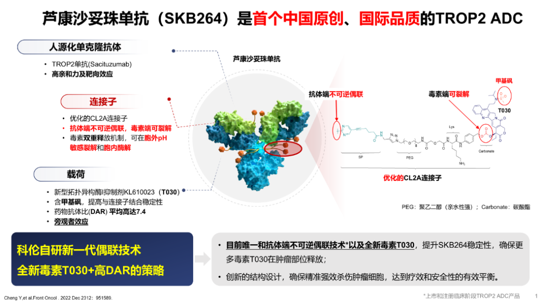 於海军教授:芦康沙妥珠单抗是首个中国原创、国际品质TROP2 ADC,由靶向TROP2的人源化单抗Sacituzumab和新型拓扑异构酶I抑制剂T030通过优化的连接子CL2A偶联而成,药物抗体比(DAR)平均高达7.4:1。芦康沙妥珠单抗通过两项开创性的技术优化了结构及稳定性:其一是Kthiol偶联技术,使用甲磺酰基嘧啶(SP)连接头与抗体不可逆偶联,避免了解耦分离;其二是T030的甲基砜结构与连接子的结合更稳定,从而保障了药物在血液循环中的稳定性,有效降低了脱靶毒性风险。芦康沙妥珠单抗通过胞外pH敏感裂解和胞内酶解的双重释放机制快速、大量释放T030,发挥强大抗肿瘤活性的同时具备旁观者效应,从而实现“魔法子弹”的功效。总之,芦康沙妥珠单抗通过靶向杀伤、旁观者效应和微环境杀伤三重机制精准强效地杀伤肿瘤细胞,兼顾疗效和安全性的全面平衡。