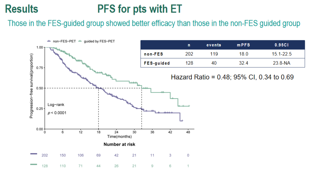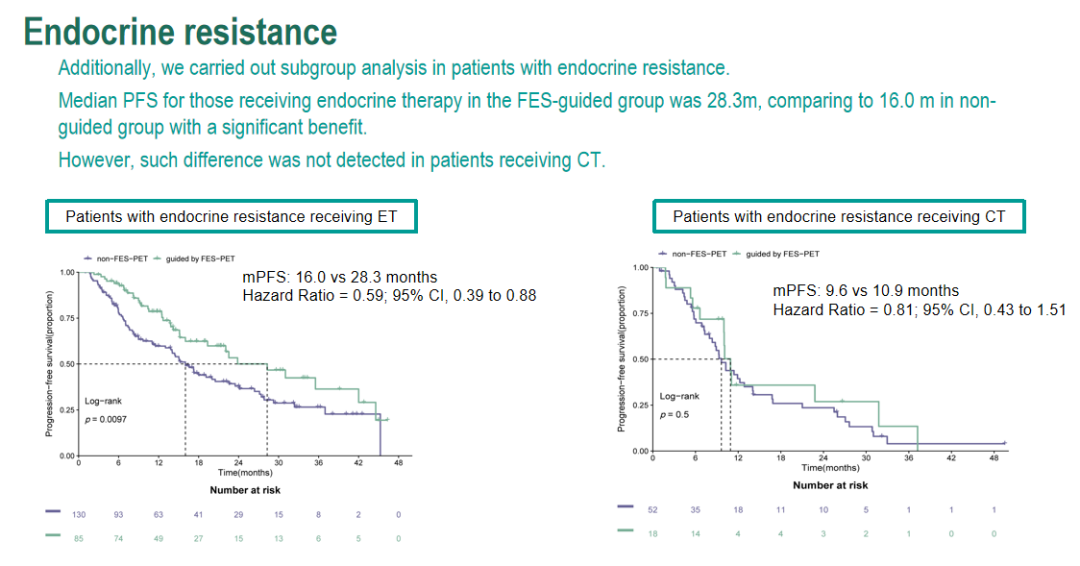 此外,我们还对内分泌耐药患者进行了亚组分析。研究发现,筛查组接受ET治疗的患者中位PFS为28.3个月,未筛查组为16.0个月(HR=0.59;95%CI:0.39~0.88,P=0.0097),获益显著。但在接受CT治疗的患者中未发现这种差异。由此可见,在内分泌耐药的患者中,通过18F-FES PET/CT评估也可以有效地筛选出适合CDK4/6i+ET治疗的患者,这有助于帮这部分患者改善预后。因此,18F-FES PET/CT筛查有望成为HR+/HER2-乳腺癌患者治疗选择的重要参考依据。