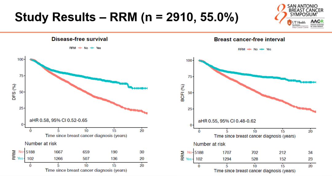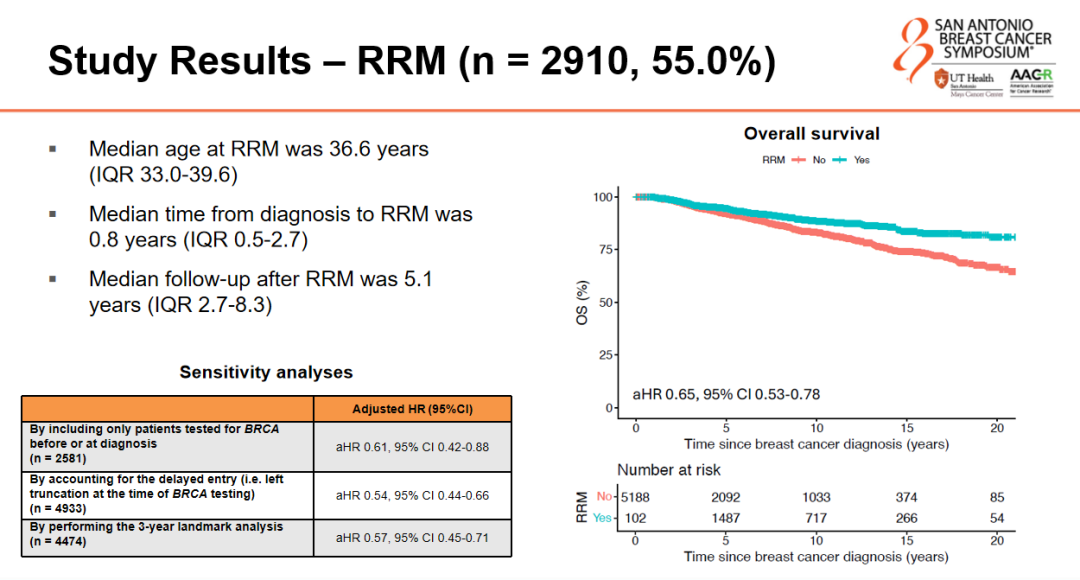 At the San Antonio Breast Cancer Symposium 2024,we have presented the results of a large international core study that included more than 5,200 patients with diagnosis of breast cancer at a young age,so 40 years or less.And all of them were known to carry a germline BRCA pathogenic variant in the BRCA genes.So they were young BRCA carriers with diagnosis of breast cancer.And in this specific analysis,we focused on the role of risk-reducing surgeries,and specifically we looked into the association between risk-reducing surgeries and survival outcomes.And the main results of this analysis have been that both risk-reducing mastectomy as well as risk-reducing salpingophorectomy were associated with significant improvement in overall survival(OS),disease-free survival(DFS),and breast cancer-free interval(BCFI),with a major advantage that was observed in all the patient subgroups.But these are data,again,that should be considered for a special patient population,so those women that are BRCA carriers and have been already diagnosed with breast cancer at a young age.