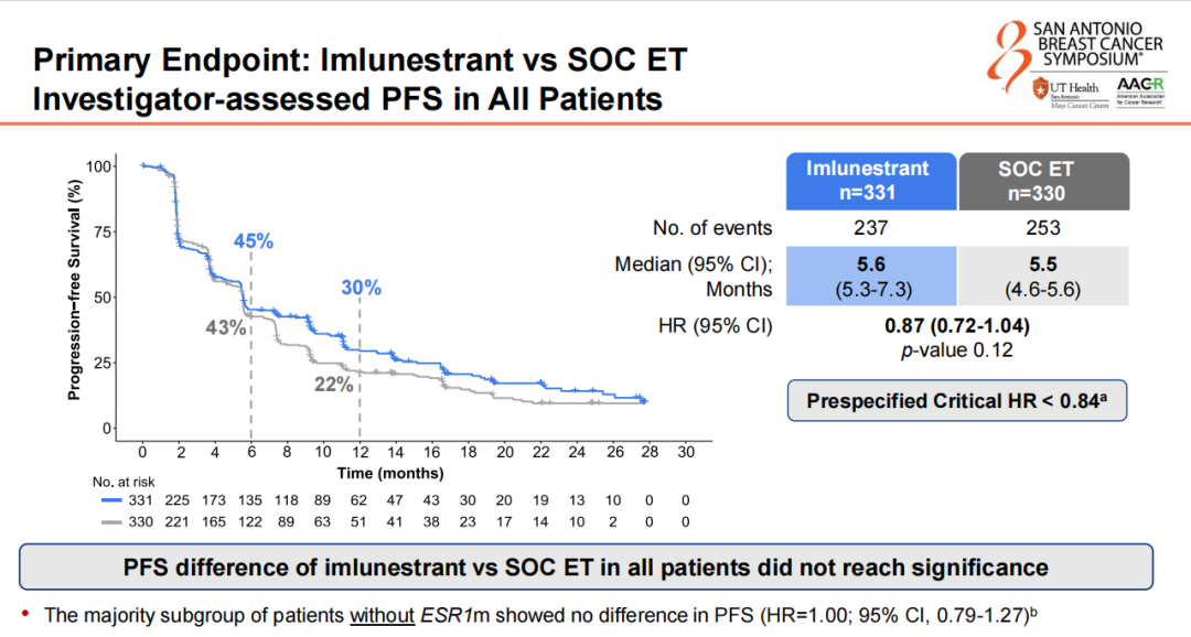 Matteo Lambertini教授:在SABCS大会上,有很多乳腺癌领域的重要研究成果进行了展示。在首日的全体会议(General Session 1)上,EMBER-3研究结果公布,该研究数据同期在《新英格兰医学杂志》(The New England Journal of Medicine)上正式发表(摘要编号:GS1-01)。这项研究探讨了一种名为Imlunestrant的口服选择性雌激素受体降解剂(SERD)在治疗HR+/HER2-且对内分泌治疗耐药的晚期乳腺癌患者中的疗效。在这项研究中,研究者探索了Imlunestrant作为单药治疗或联合阿贝西利治疗的效果,并将其与标准内分泌单药治疗(如氟维司群或芳香化酶抑制剂)进行了比较。研究结果最终发表在《新英格兰医学杂志》上,该研究数据非常重要,可能会对临床实践产生变革性影响。