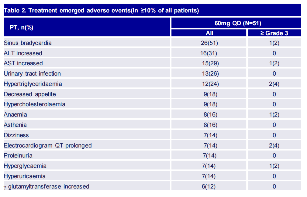 SIM0270的中位治疗时间为16.3周(0.3~70.7周),总体安全性与剂量递增部分一致。治疗中出现的不良事件(TEAE)发生率为100%,且多为1~2级。最常见的TEAE(发生率≥20%)为窦性心动过缓、ALT升高、AST升高、尿路感染和高甘油三酯血症(Table 2)。大多数窦性心动过缓是1级和无症状的。没有患者因治疗相关严重不良事件(SAE)而停止治疗。