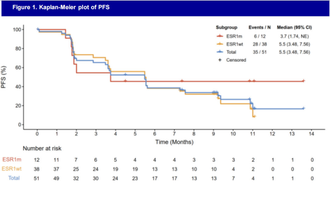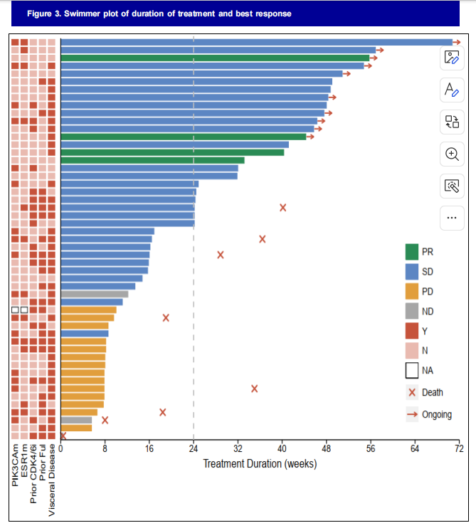 确认的客观缓解率(ORR)为8.3%(Figure 2),24周时的临床获益率(CBR)为37.8%,ESR1突变患者的CBR为40.0%,ESR1野生型患者的CBR为38.2%。