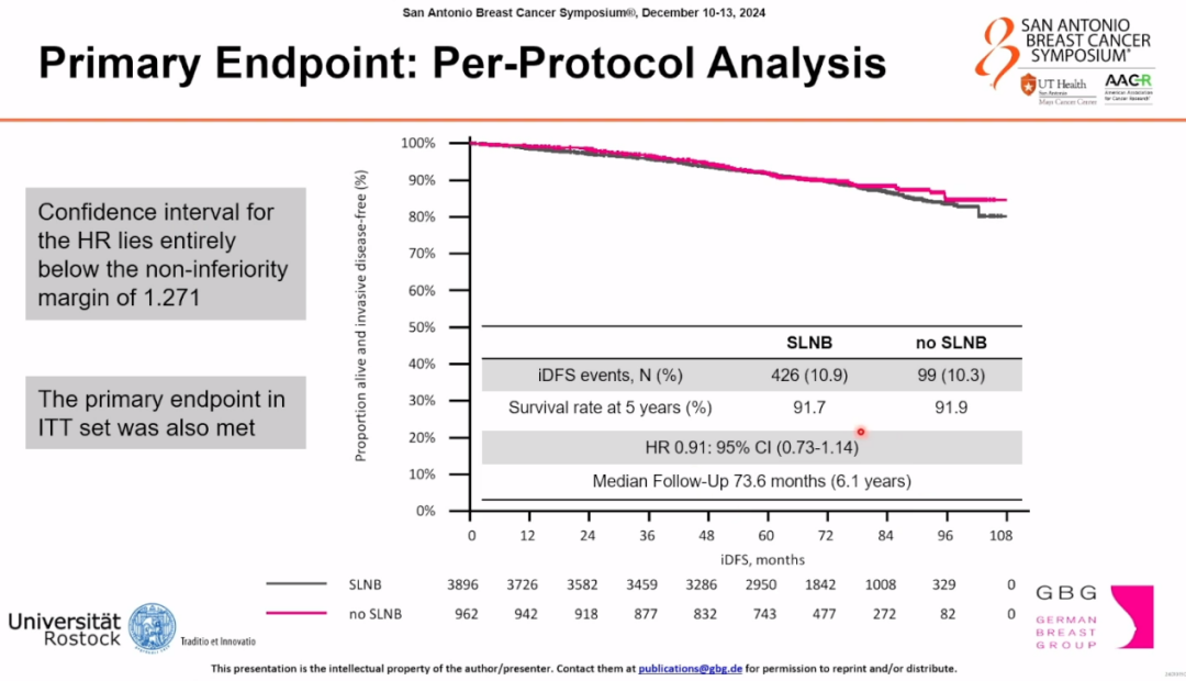 我认为本环节最重要的内容可能是INSEMA研究(GS2-07)结果的公布。这项试验比较了前哨淋巴结活检与完全不进行腋窝手术的随机分配方案。至少目前来看,我们可以说,如果仔细筛选患者——如年龄较大的患者、低分级患者和低风险的DCIS患者,那么部分患者可以考虑不进行前哨淋巴结活检。这与2023年St.Gallen会议上Gentilini博士展示的SOUND试验非常相似。不过,INSEMA研究的规模要大得多,数据质量也令人印象深刻。因此,我认为这项研究可能会改变临床实践,对于风险非常低的患者,省略腋窝清扫手术可能是安全的。这篇文章同期发表在《新英格兰医学杂志》上,显然也体现了INSEMA研究的重要性。