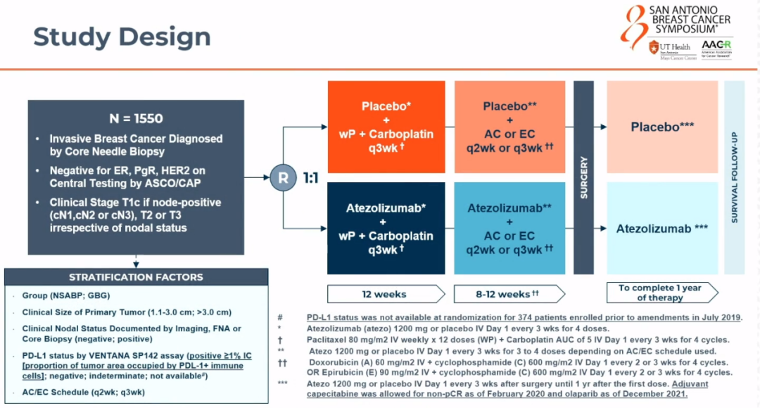 该研究是一项双盲的III期临床试验,研究对象是确诊为II期或III期三阴性乳腺癌的女性患者,并且这些患者接受根治性辅助化疗。在美国,我们通常使用的标准治疗方案是紫杉类药物联合卡铂,然后再用蒽环类药物联合环磷酰胺。现在,在美国以及世界上许多其他国家,基于KEYNOTE-522研究的结果,治疗标准已经升级为在新辅助治疗和辅助治疗期间联合使用免疫检查点抑制剂帕博利珠单抗。