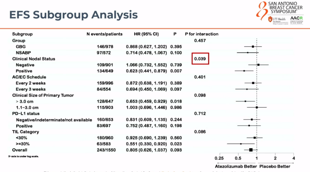 因此,我们研究中有一半未达到pCR的患者接受了卡培他滨治疗。这反映出我们与其他研究在患者群体和治疗方案上存在一些差异,我相信这些差异在进行交叉试验比较时会引起关注。最终的研究结果是,我们的研究未能达到主要终点,数据未能证明标准化疗中加入阿替利珠单抗可以使EFS有显著的统计学改善。因此,从验证明确疗效的角度来看,我们的研究结果是阴性的。不过,在亚组分析中我们发现,淋巴结阳性的患者似乎从中有所获益。尽管未达到主要终点,但这一发现可能为未来的研究提供重要的线索。