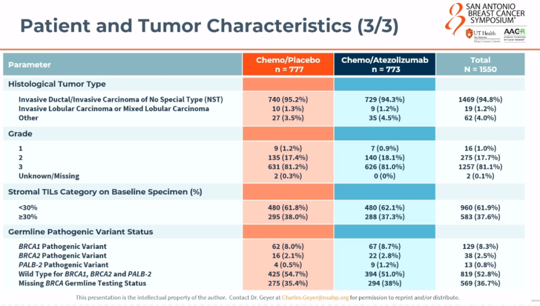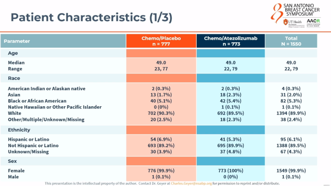 So it was a pretty broad eligibility criteria.The median age of our patients was 49,so it was a younger patient population,but a pretty healthy population.In terms of our stratification variables that we chose for our study,since we were doing recruitment here in the U.S.and Canada.The Germans were going to be doing recruitment in Spain and Germany.So we made continent,so to speak,Europe or U.S.,one of our stratification factors.We made clinical nodal status,a stratification factor,positive versus negative.We also made tumor size.We decided to split our three centimeters.The typical T and M is zero to two,two to five,five or greater.But we knew that if we kind of wanted to have roughly equal groups,so we said up to three and above three,that was a stratification variable.We included PD-L1 as a stratification,PD-L1 staining using the SP142 assay as one of our stratification variables.And then the final stratification variable was the regimen,the rate that they gave the AC or EC,dose down,was it every two weeks?Every three weeks.That was the other stratification variable that we used.
