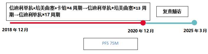 患者符合我科正在开展的一项“评估信迪利单抗或安慰剂联合培美曲塞和铂类化疗用于晚期或复发性肺鳞状细胞非小细胞肺癌一线治疗有效性和安全性的随机,双盲,III期研究(ORIENT-11)”临床研究入组条件,应用信迪利单抗或安慰剂联合培美曲塞+卡铂治疗4周期,信迪利单抗或安慰剂联合培美曲塞维持治疗13周期,后应用信迪利单抗或安慰剂应用至2年。试验结束后出组,揭盲患者为信迪利治疗组。治疗期间最佳疗效肺内病灶近CR(图6)。停药后每3个月-6个月复查随访,未见肿瘤复发转移征象(图6),截止至目前为止,一线无进展生存已超过75个月。