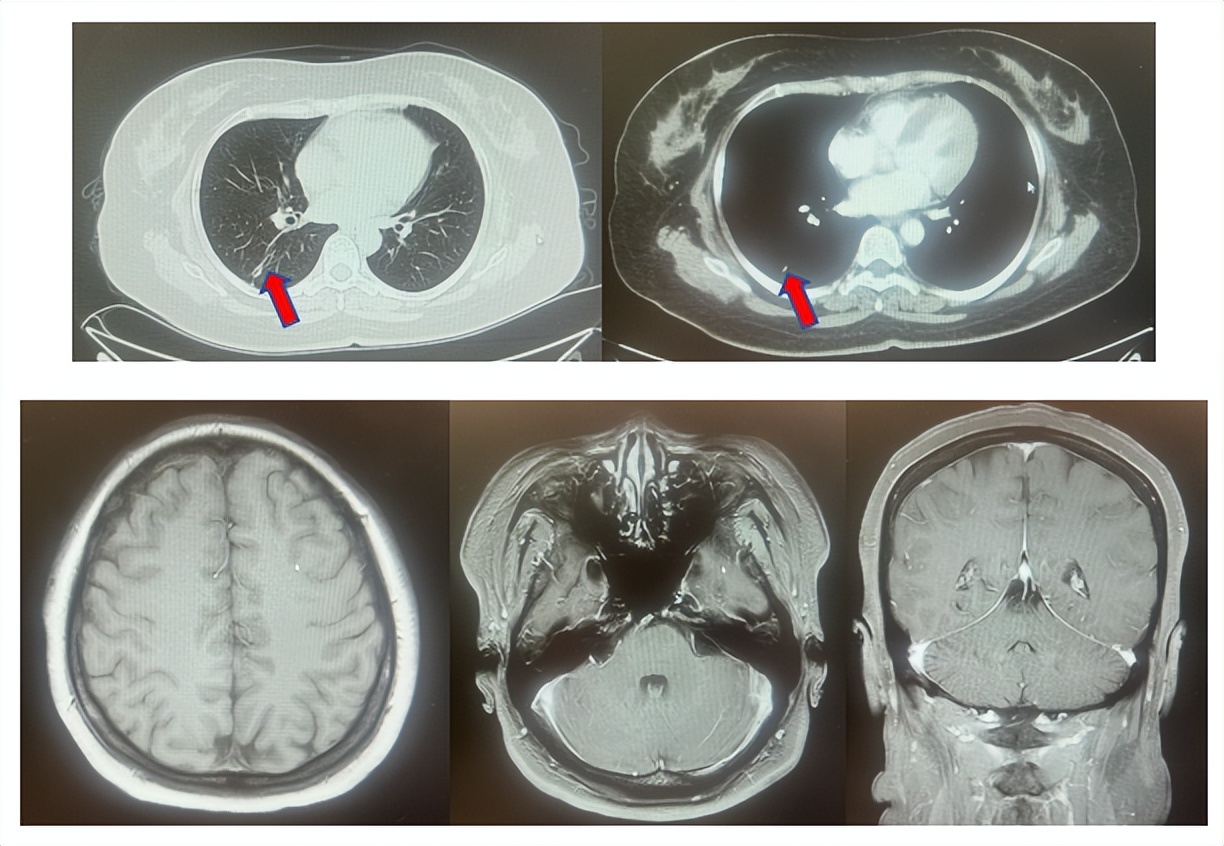 图1:上两图分别展示基线肺CT肺窗及纵隔窗影像,下三图表示脑MRI影像。红色箭头指示病灶位置,分别为右肺肿物、右侧肺门转移病灶、左侧顶叶病灶、右侧小脑病灶及冠状面上的颅内两个病灶。