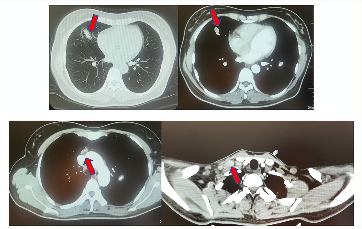 肺+全腹CT:右肺下叶占位、伴纵隔多发淋巴结肿大,恶性可能性大;右侧心膈角结节,左侧胸廓入口淋巴结增大。