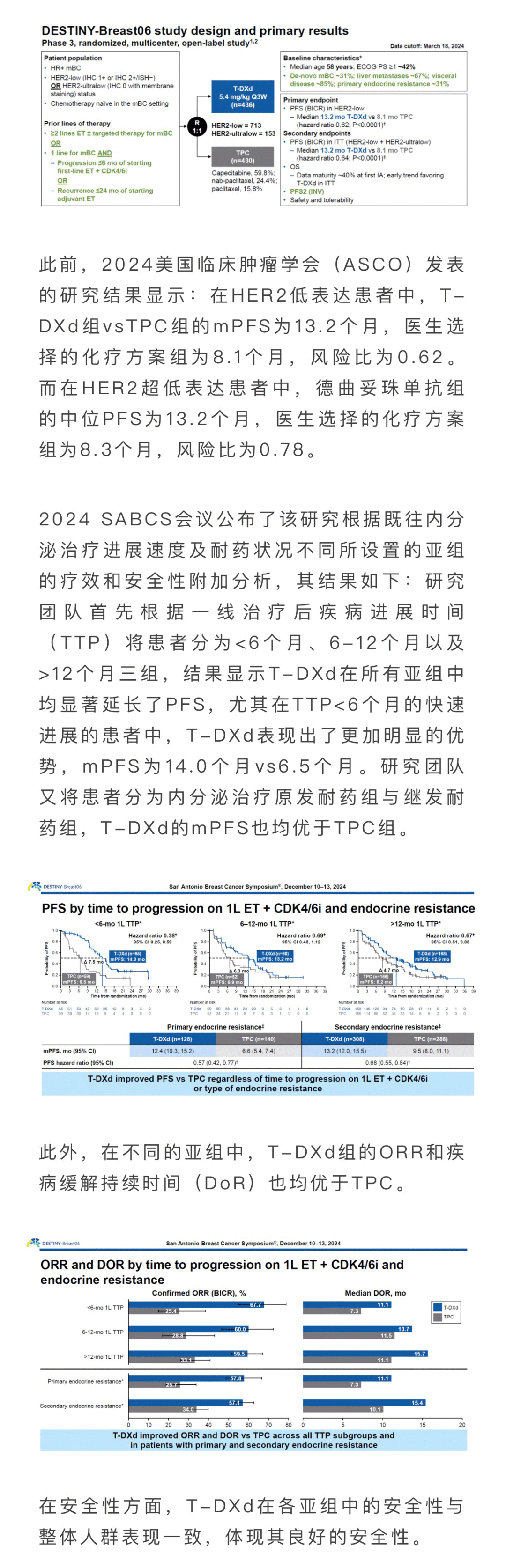 [2].Xichun Hu,Rebecca Dent,Giuseppe Curigliano,et al.Efficacy and safety of trastuzumab deruxtecan(T-DXd)vs physician’s choice of chemotherapy(TPC)by pace of disease progression on prior endocrine-based therapy:additional analysis from DESTINY-Breast06.2024 SABCS LBA1-04.