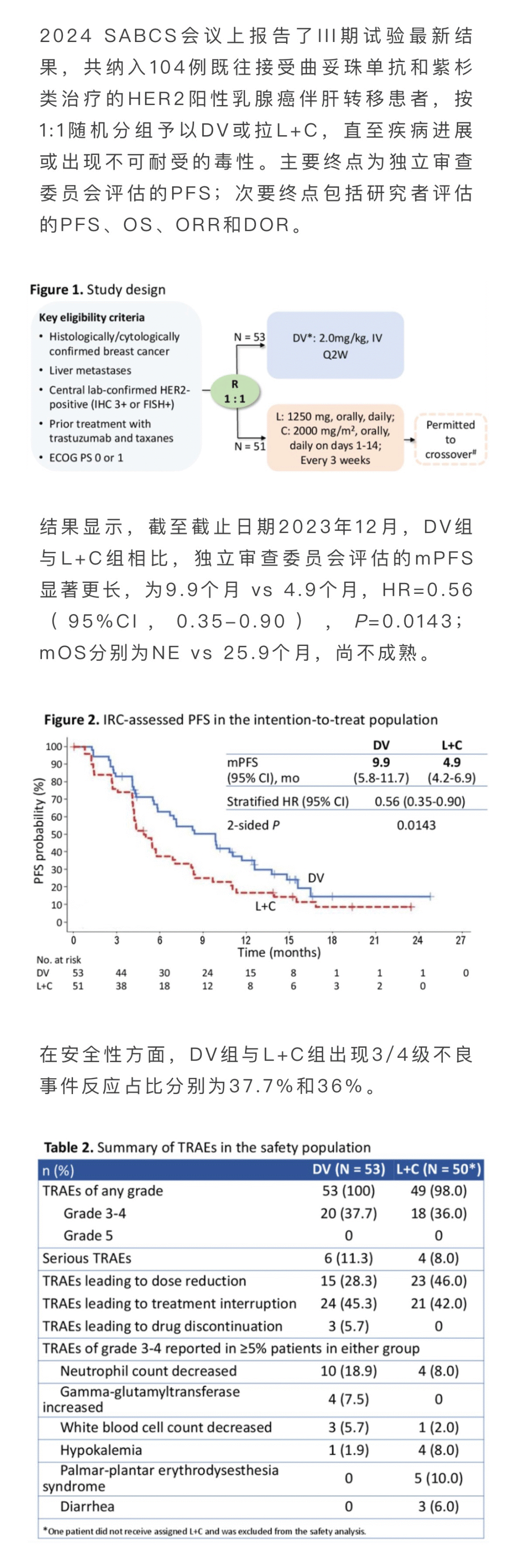 [3].Jiayu Wang,Quchang Ouyang,Binghe Xu,et al.A randomized,open-label phase III study comparing disitamab vedotin(an anti-HER2 monoclonal antibody-MMAE conjugate)with lapatinib plus capecitabine in patients with HER2-positive,advanced breast cancer with liver metastasis.2024 SABCS PS8-06.