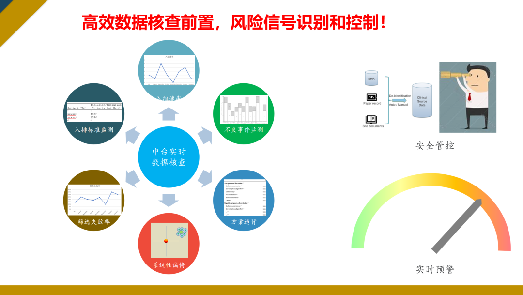 该平台致力于临床试验数据安全性与质控前置的高度融合模型,包括临床数据仓库(CDR)、临床数据捕获系统(CDC)等医院内网数据,CTSM数据中转站、数据中台等隔离区(DMZ)数据,以及电子数据捕获系统(EDC)和临床试验管理系统(CTSM)等外网云数据。对这些数据的实时管理,能够实现核查前置和实时预警,包括入排标准检测、入组速率、筛选失败率、不良事件检测、方案违背、系统性偏倚等各个环节。
