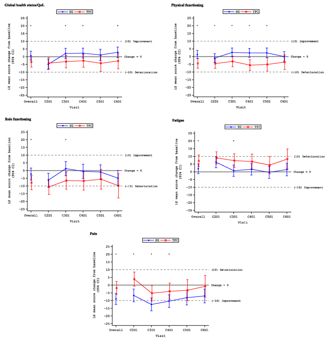 在生活质量(QoL)方面,ASCENT研究患者报告的结局(PRO)取得了积极结果,显示SG较TPC在整体生存状况/生活质量(GHS/QoL)、生理机能(PF)、生理职能(RF)、虚弱、疼痛五个QoL维度的得分均具有显著改善[16]