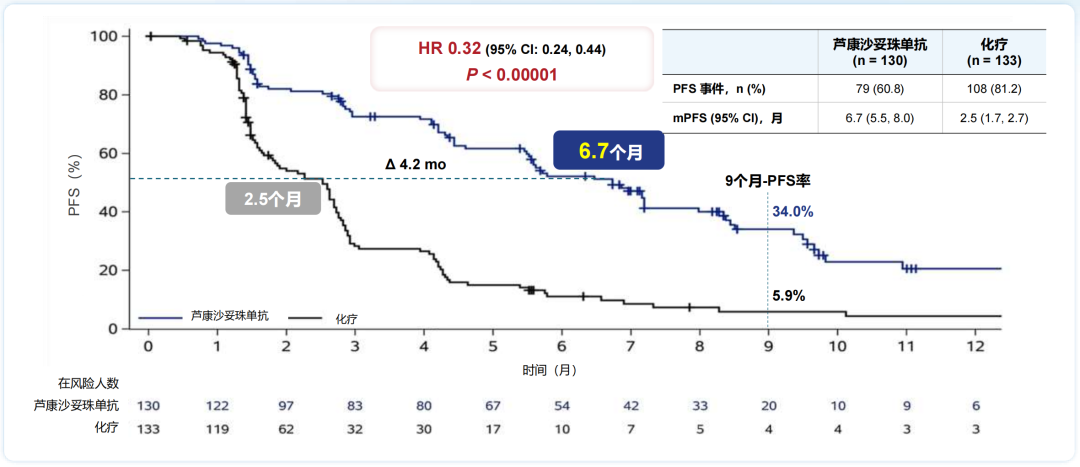 关键次要终点OS也显示获益,芦康沙妥珠单抗组和化疗组的中位OS分别为未达到(NR)和9.4个月,死亡风险显著降低47%(HR 0.53,95%CI:0.36-0.78,P=0.0005);而且所有亚组均展现出一致的OS获益趋势。此外,芦康沙妥珠单抗展现了高于化疗的强效肿瘤缓解效果,ORR是化疗的近4倍(45.4%vs 12.0%),中位持续缓解时间(DoR)是化疗的2倍多(7.1 vs 3.0个月)。