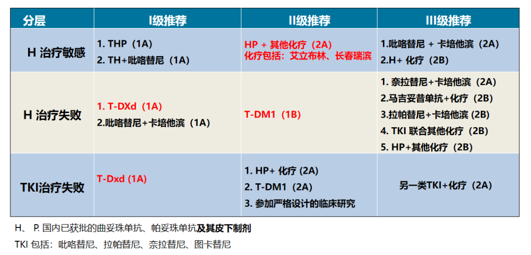 对于H治疗失败患者的I级推荐,随着T-DXd可及性的提升,2025版CSCO BC指南将T-DXd与吡咯替尼方案的推荐顺序进行了调整,先推荐T-DXd,其次推荐吡咯替尼+卡培他滨,证据级别都为1A类,而T-DM1的被调至II级推荐,证据级别为1B类。对于TKI治疗失败的患者,I级推荐新增T-DXd(1A)方案。