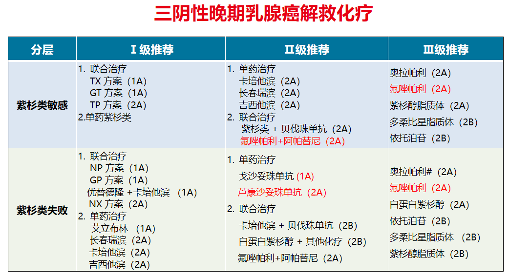 三阴性乳腺癌:对于紫杉类治疗敏感/失败的患者,调整了单药化疗与联合化疗与的顺序,更强调联合治疗的有效性。在紫杉类治疗敏感的患者中,II级推荐新增氟唑帕利联合阿帕替尼(2A)方案,III级推荐增加氟唑帕利(2A)。在紫杉类治疗失败的患者中,II级推荐戈沙妥珠单抗的推荐类别调整为1A类,并新增芦康沙妥珠单抗(2A)的治疗推荐;III级推荐增加氟唑帕利(2A)。此外,指南指出解救阶段未使用过免疫治疗,同时无免疫治疗禁忌者,应优选化疗+免疫治疗,并将PD-1抑制剂的适应证进行了简述,突出了化疗联合免疫治疗在PD-L1阳性人群治疗中的重要地位。