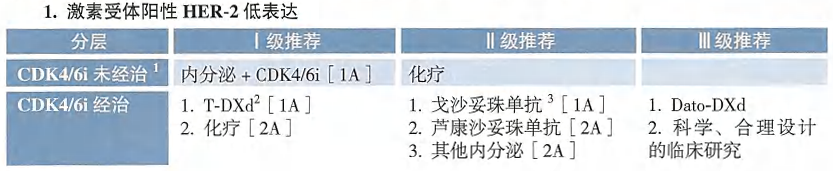 激素受体阳性乳腺癌:CDK4/6抑制剂联合内分泌治疗仍是HR+晚期乳腺癌患者的标准治疗推荐。对于HR+/HER2低表达晚期乳腺癌患者,我们可以看到新型ADC药物在CDK4/6抑制剂经治后的患者治疗中地位凸显。DESTINY-Breast04研究、DESTINY-Breast 06研究结果提示,在CDK4/6抑制剂治疗失败后的患者中,相较于化疗,T-DXd可以获得更长的生存获益,因此,I级推荐中T-DXd作为1A类证据。同时,新型ADC药物戈沙妥珠单抗及芦康沙妥珠单抗也分别作为CDK4/6抑制剂经治后患者的II级推荐。