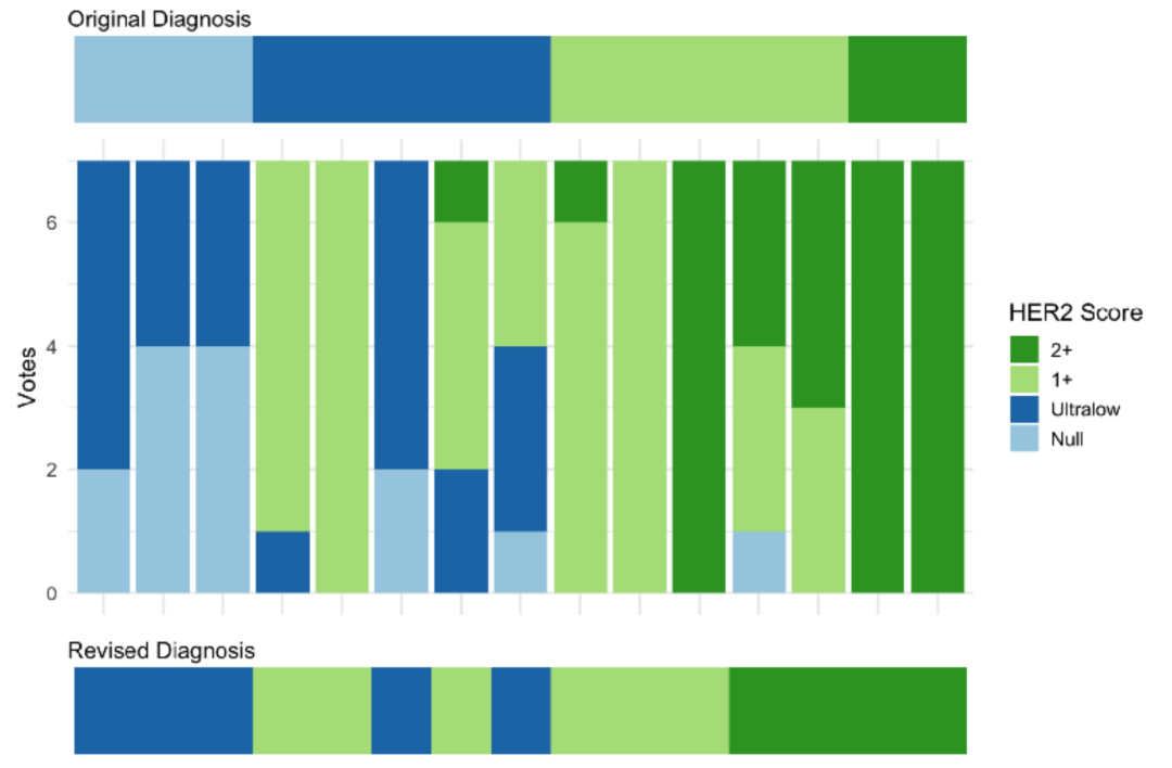 有8例(53.3%)产生显著分歧(定义为至少2例病理专家持不同意见),包括原始诊断HER2 0的3例、HER2超低表达的3例,HER2 1+的2例。在产生显著分歧的8个病例中:所有3个原始诊断HER2 0的病例,经病理专家审查后重新分类为HER2超低表达;此外,2个HER2 1+病例在经审查升级为HER2 2+,1个HER2超低表达病例被诊断为HER2 1+。