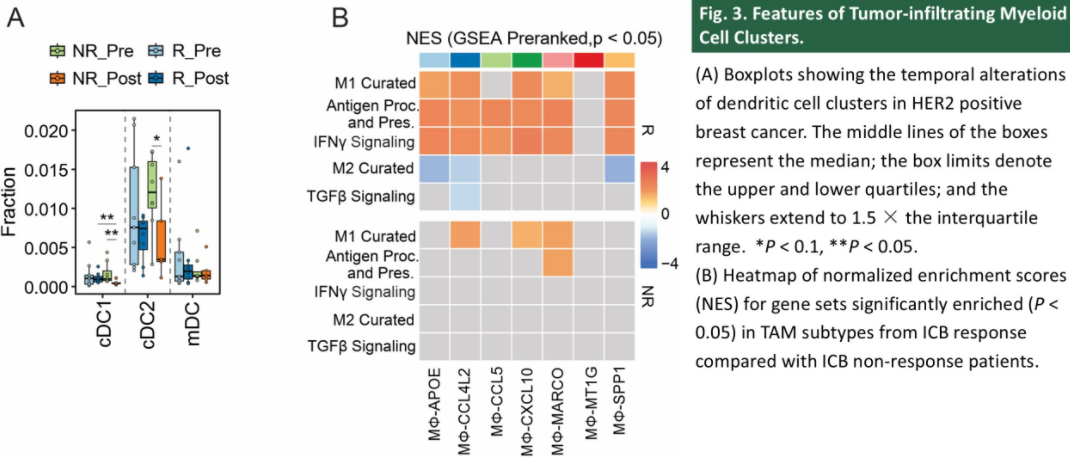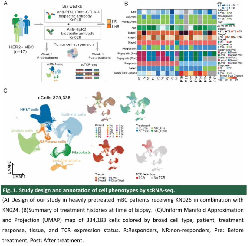 本中心参与了一项多中心II期临床试验(NCT04521179),旨在评估新型抗CTLA-4/PD-L1双特异性抗体KN046联合新型抗HER2双特异性抗体KN026在二线及后线治疗失败的进展期HER2阳性乳腺癌中的有效性和安全性。该联合治疗方案的客观缓解率(Objective Response Rate,ORR)约为47.2%,3/4级毒性发生率为27.8%,未发生5级毒性。治疗前后分析肿瘤微环境(TME)变化对寻找治疗更获益人群、治疗耐药机制至关重要。因此,我们对联合治疗前后的肿瘤标本进行了单细胞测序分析,拟深入探索TME变化及其与治疗反应的相关性。