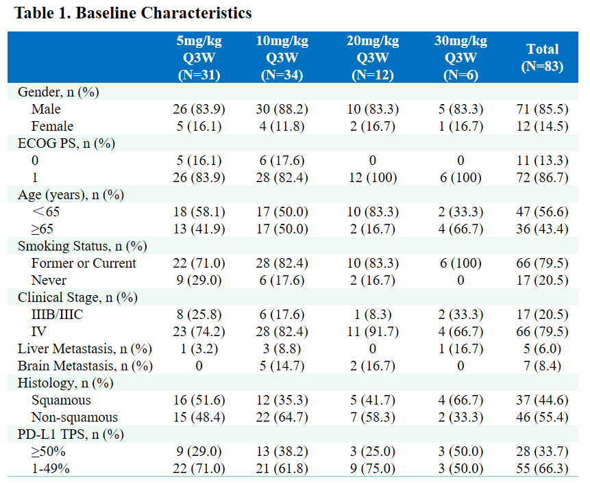 截至2025年3月26日,共入组83例晚期NSCLC患者接受SSGJ-707单药治疗,其中SSGJ-707 5mg/kg Q3W入组31例,10mg/kg Q3W入组34例,20mg/kg Q3W入组12例,30mg/kg Q3W入组6例。83例患者中,44.6%为鳞状NSCLC,33.7%患者PD-L1高表达(TPS≥50%)。