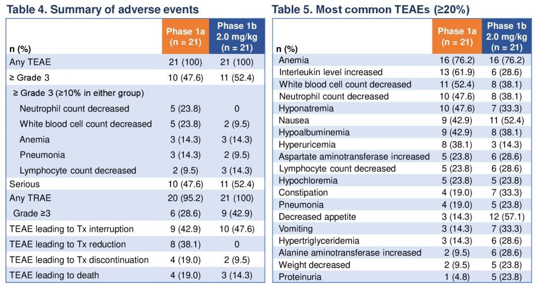 截至2025年3月28日,Ia期研究已完成21例患者的剂量递增研究,结果显示4mg/kg剂量组中1例患者出现DLT(发热性中性粒细胞减少症和白细胞计数下降),最终确定MTD为4 mg/kg。安全性数据方面,Ia期和Ib期3级及以上治疗相关不良事件(TRAE)发生率分别28.6%和42.9%,最常见的不良事件为血液学毒性、低钠血症、恶心等。Ib期研究数据显示,2mg/kg HLX43应用于NSCLC血液学毒性较低(≥3级的贫血14.3%,淋巴细胞下降14.3%,血小板下降0%,中性粒细胞下降0%),整体安全可控,耐受性较好,为未来扩展至一线疗法及联合治疗方案奠定了基础。