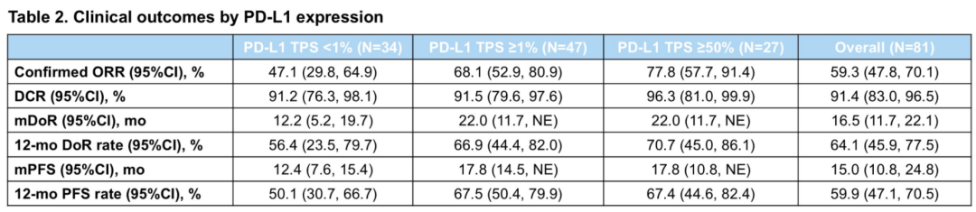 本次ASCO会议上,我们主要更新报告了81例非鳞NSCLC患者的数据,总体人群的中位PFS达到了15.0个月。这一结果令人瞩目,因为目前在非鳞NSCLC晚期一线治疗中,化疗联合PD-1免疫治疗是标准方案,其中位PFS大约为9~10个月。亚组分析显示不同PD-L1表达水平的患者均有治疗获益,PD-L1 TPS<1%、≥1%和≥50%患者的中位PFS分别为12.4、17.8和17.8个月。在ORR方面,总体人群为59.3%,PD-L1 TPS<1%、≥1%和≥50%分别为47.1%、68.1%和77.8%。安全性结果与既往报道一致,显示良好的耐受性。这项研究以其卓越的疗效数据,在今天的壁报专栏中受到了国际专家的高度关注和肯定。