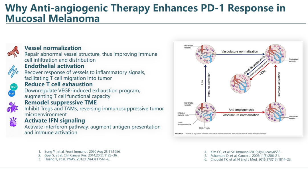MM在西方人群中较为罕见,但在中国及亚洲患者中有一定的比例,仍存在不小的临床治疗需求。在围手术期治疗方面,尽管免疫治疗在黑色素瘤治疗中取得了巨大成功,但化疗仍然是MM辅助治疗的基石。目前正在探索将抗PD-1联合VEGF-TKI用于MM新辅助治疗。对于晚期MM的治疗,单独使用抗PD-1单药治疗或抗PD-1联合抗CTLA4/LAG3/CTLA4+LAG3显示疗效有限。然而,抗VEGF联合免疫治疗MM则具有较好的治疗活性,期待未来有进一步的扩大样本的前瞻性研究加以验证,并且有其他新型机制的药物用于此类患者的治疗研究中。