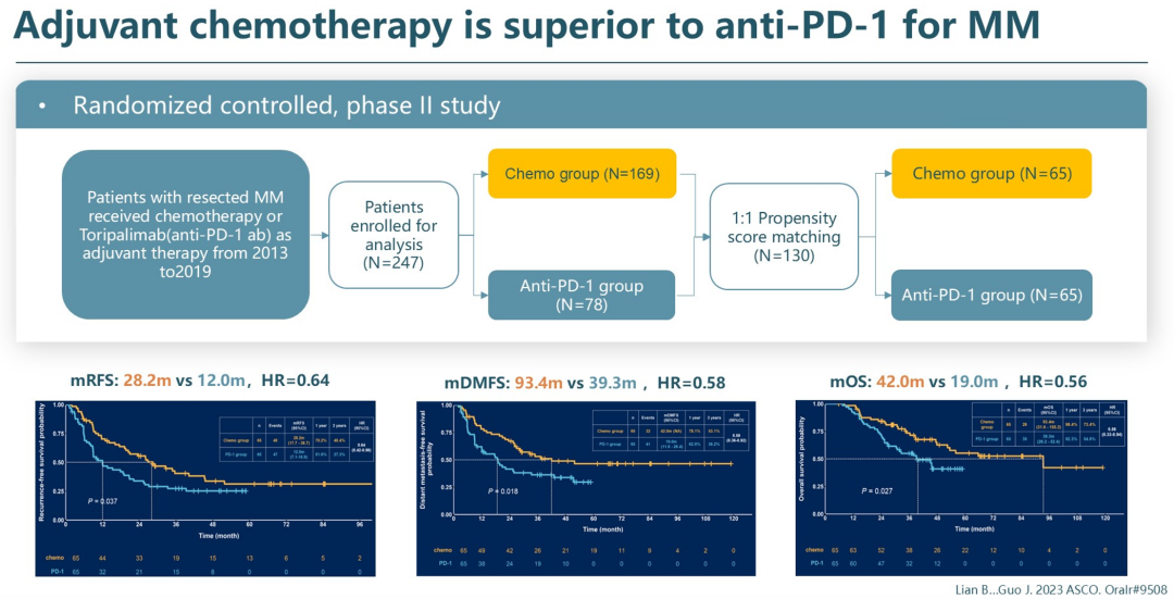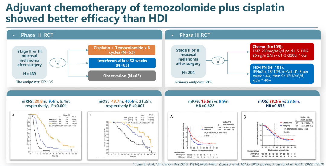 北京大学肿瘤医院团队开展的II期研究显示,单药特瑞普利单抗与传统干扰素辅助治疗相比同样未能改善RFS,仅在PD-L1+人群中有改善趋势(17.4 vs 11.1个月);而另一项III期研究显示,替莫唑胺联合顺铂(TMZ+DDP)相较于高剂量干扰素(HDI)具有更好的RFS(15.5 vs 9.9个月,HR 0.622),表明传统化疗在MM辅助治疗中仍有重要价值。随后,我们进一步报道化疗对比抗PD-1辅助治疗MM的II期研究显示,化疗组的RFS(28.2 vs 12.0个月,HR 0.64)、OS(42.0 vs 19.0个月,HR 0.56)均显著优于抗PD-1治疗组。