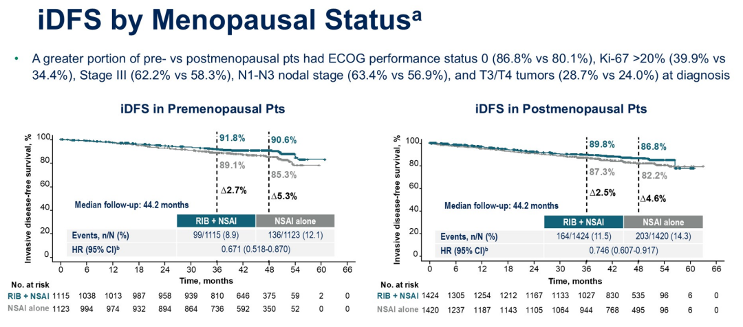 此外,在CDK4/6i广泛应用的今天,绝经前患者有了更多治疗选择。此次报道NATALEE研究根据绝经状态的数据分析显示,绝经前患者(HR 0.671)和绝经后(HR 0.746)患者的生存获益相似,这表明无论是在绝经前还是绝经后患者中,使用CDK4/6i都是一个有效的选择。当然,CDK4/6i更加远期的生存获益还需要继续随访跟踪。