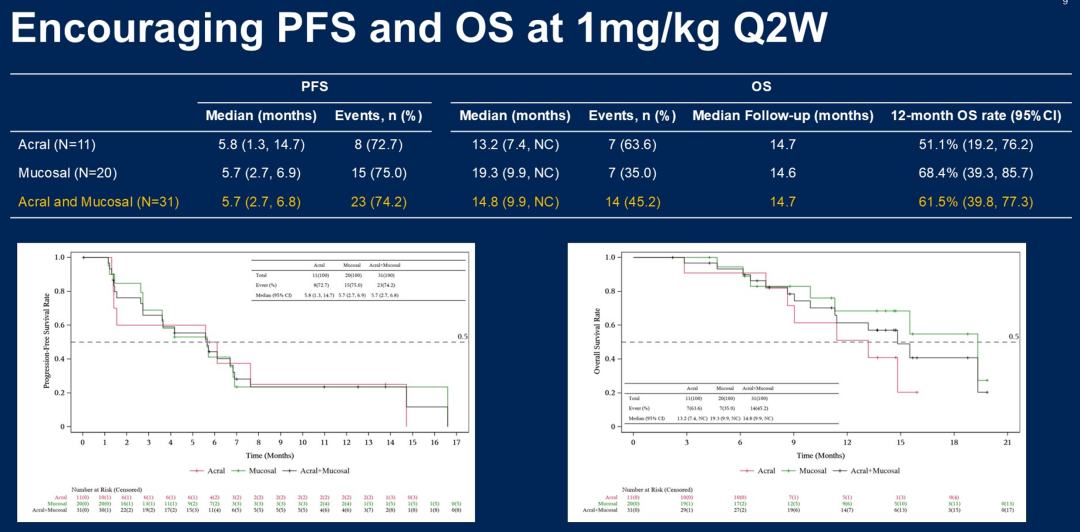在87例可评估的晚期患者中,IBI363的客观缓解率(ORR)为24%。实际上,这一有效率数据对于肢端和黏膜黑色瘤患者而言是非常高的。从既往报道数据来看,无论是进口的PD-1还是国产的PD-1单药治疗,KEYNOTE-151、POLARIS-01等研究中单药免疫治疗的有效率未超过15%,无进展生存期(PFS)仅为2个月左右。