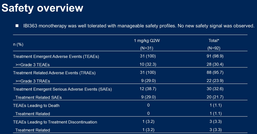 本研究中,对于这些已经使用PD-1单抗或其他免疫制剂治疗失败的黑色素瘤患者时,即使作为二三线及以上治疗,IBI363依然能够达到24%的有效率,这无疑是一个非常惊人的数据。因为即使是从未接受过治疗的一线患者,单药免疫治疗也很难达到如此高的有效率。此外,IBI363的PFS达到了5.7个月,这一数据几乎是既往单药PD-1单抗治疗PFS的两倍。