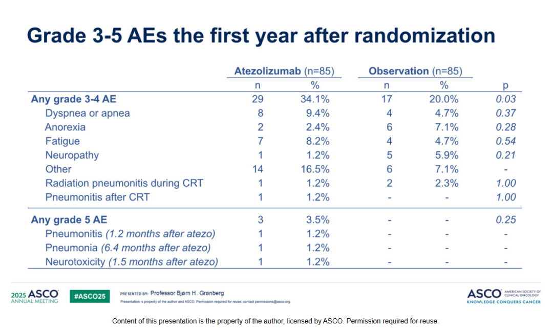 安全性评估:随机分组后(即CRT治疗后),阿替利珠单抗组34%报告3-4级毒性事件,对照组为20%。治疗相关死亡3例(神经毒性、肺炎和肺部感染),均发生在阿替利珠单抗组。