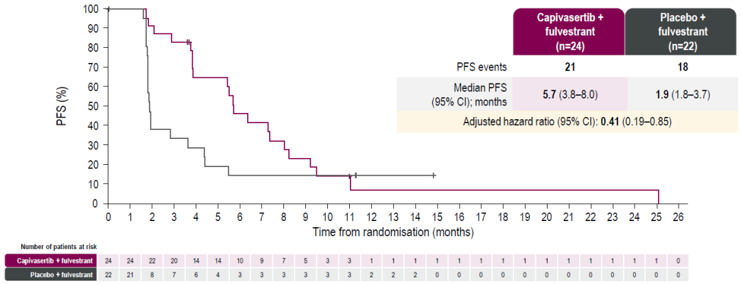 △2023年ESMO ASIA大会上,胡夕春教授报告的CAPItello-291研究中国队列总体人群(上)和AKT通路改变(下)患者的PFS