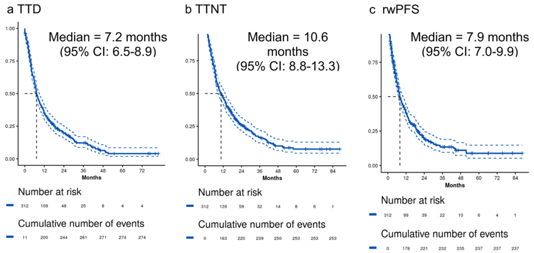 中位至治疗失败时间(TTD)为7.2个月。中位至下阶段治疗时间(TTNT)为10.6个月。中位真实世界无进展生存期(rwPFS)为7.9个月。在116名基于曲妥珠单抗的2线治疗亚组,中位TTD为10.6个月;中位TTNT为14.9个月;中位rwPFS是13.6个月。