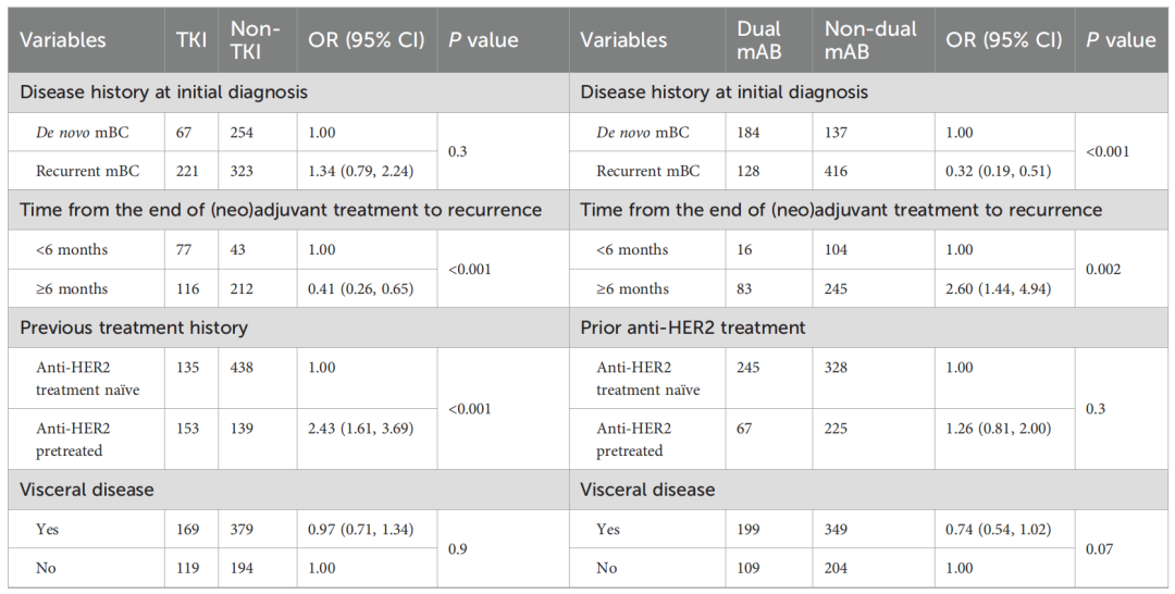 多变量Cox回归模型分析显示,与(新)辅助治疗后<6个月内复发患者相比,>6个月复发患者的rwPFS更长(HR 0.65,P=0.008;校正HR 0.70,P=0.03);相比接受双靶一线治疗的患者,接受非双靶一线治疗的患者疾病进展或死亡风险显著更高(HR 1.60,P<0.001)。
