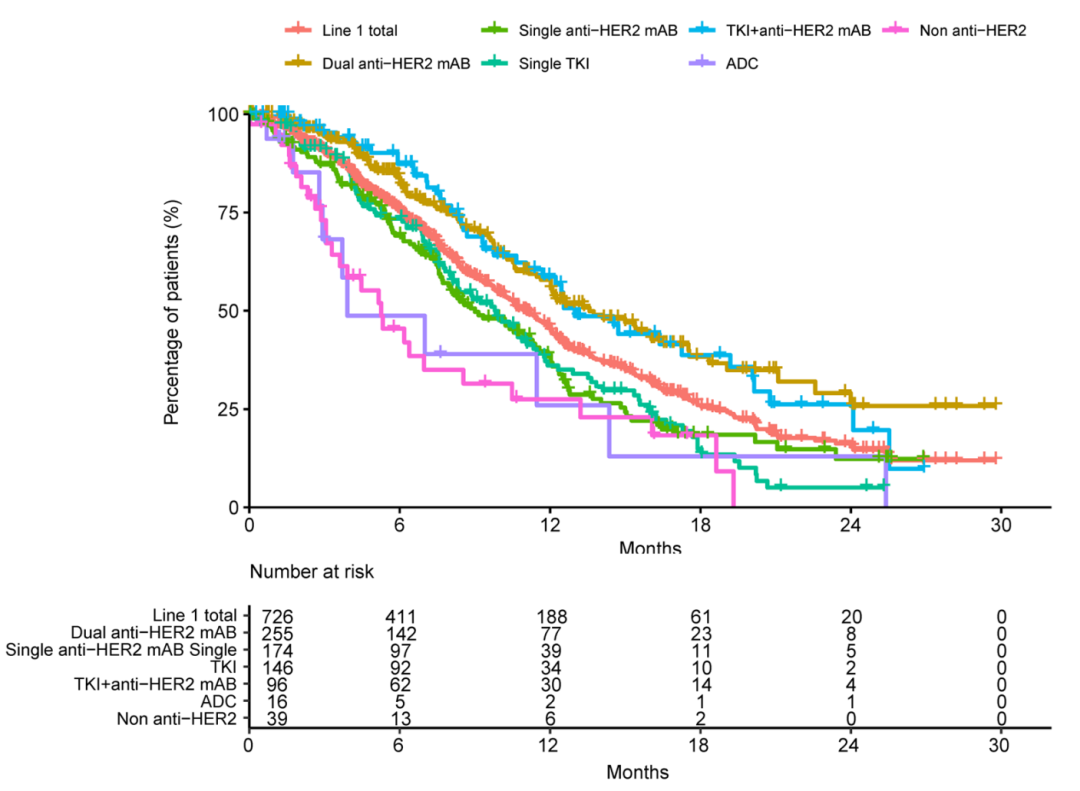 研究共获得865例(100.00%)至少接受过一线晚期全身治疗的HER2+mBC患者资料,其中38.15%的患者有二线治疗信息,15.05%的患者有二线后的治疗信息。考虑到真实世界使用情况的复杂性,将抗HER2治疗分为以下6组: