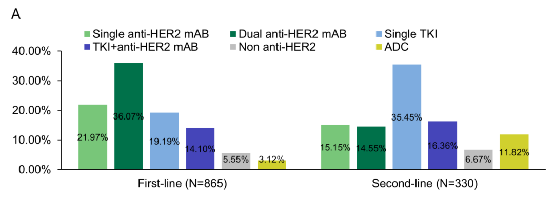 既往治疗是影响医生选择一线治疗的关键因素。图3显示了一线治疗选择的分布。在571例未经抗HER2治疗的患者中,mAB双靶治疗是最常见(42.91%)的一线选择;在294例抗HER2经治的患者中,最常见的治疗方案则是单药TKI(39.46%)和mAB双靶治疗(23.13%)。