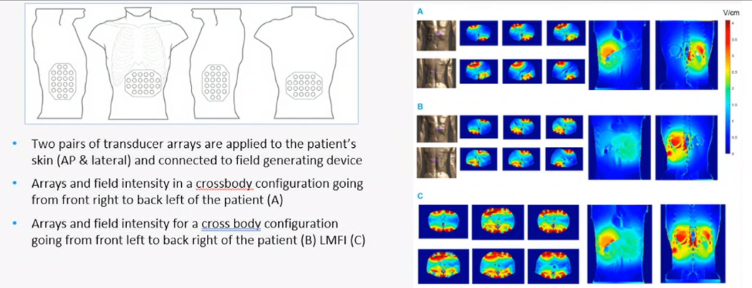 图1.胰腺癌电场治疗示意图:腹部有效电场分布