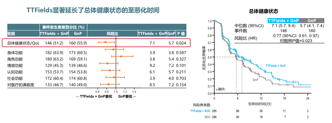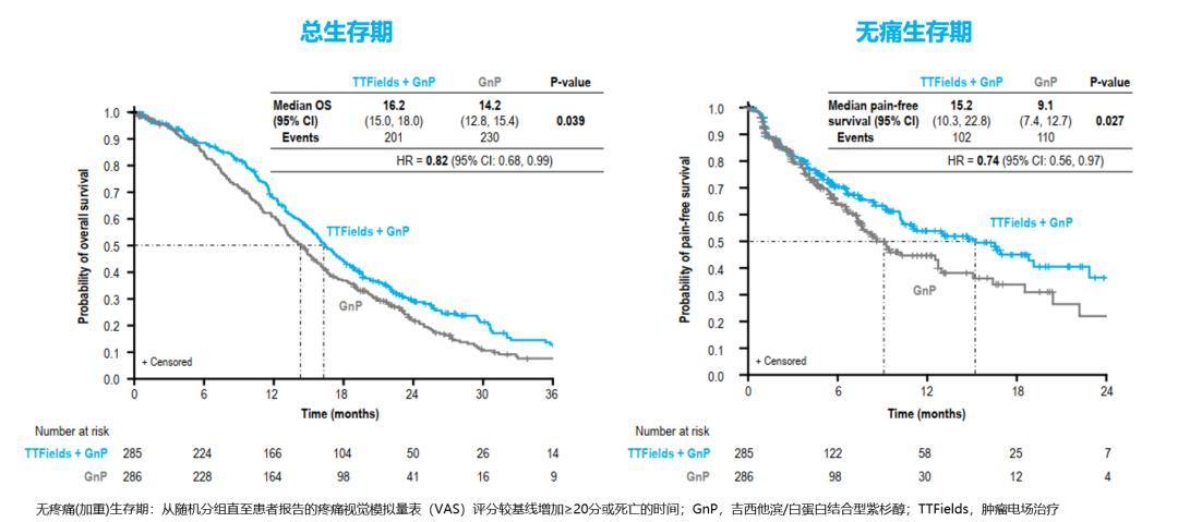 在生活质量(QoL)方面,TTFields联合化疗可缓解疼痛症状,显著改善患者生活质量。TTFields联合化疗将无疼痛生存期延长了6.1个月(中位无疼痛生存期:15.2个月vs 9.1个月,HR=0.74,P=0.027),总体健康状态无恶化时间更长(7.1个月vs 5.7个月,HR 0.77,P=0.023)(图3)。TTFields安全性较好,联合治疗不会加重化疗全身毒性。TTFields的主要不良事件为轻中度的皮肤AE,包括皮炎(27.7%)、皮疹(17.5%)和瘙痒(15.0%)等。