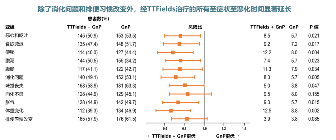 另外,除消化不良和排便习惯改变外,TTFields组的其他消化症状无恶化时间均更长,整体生活质量维持的更好,且佩戴TTFields也未加重失眠等一般症状(图6)。