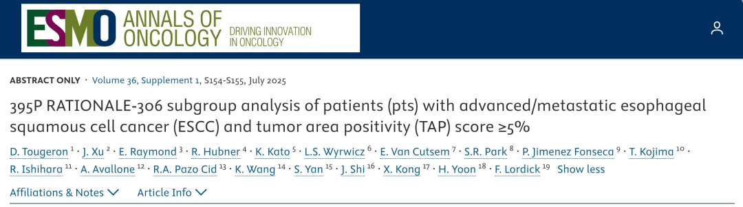 Tougeron,D.et al.2025 ESMO GI 395P RATIONALE-306 subgroup analysis of patients(pts)with advanced/metastatic esophageal squamous cell cancer(ESCC)and tumor area positivity(TAP)score≥5%.Annals of Oncology,Volume 36,S154-S155