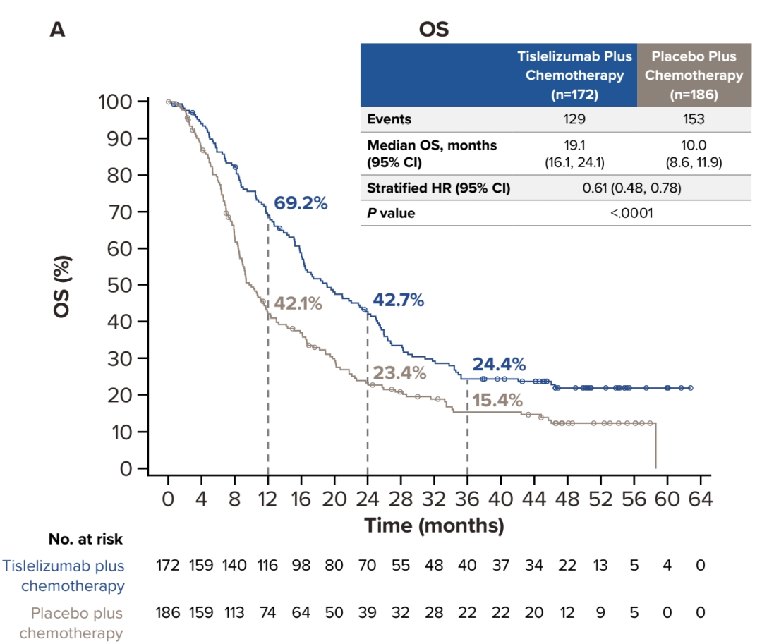 在安全性和耐受性方面,替雷利珠单抗联合化疗组较安慰剂联合化疗组具有更高比例的≥3级及严重治疗相关不良事件(TRAEs),主要为中性粒细胞计数减少(35.1%vs 31.9%)、白细胞计数减速(12.3%vs 17.8%)和贫血(13.5%vs 11.4%),发生率与同类治疗方案的经验相符,未出现预期之外的安全性信号,总体可预期和可管理(表3)。