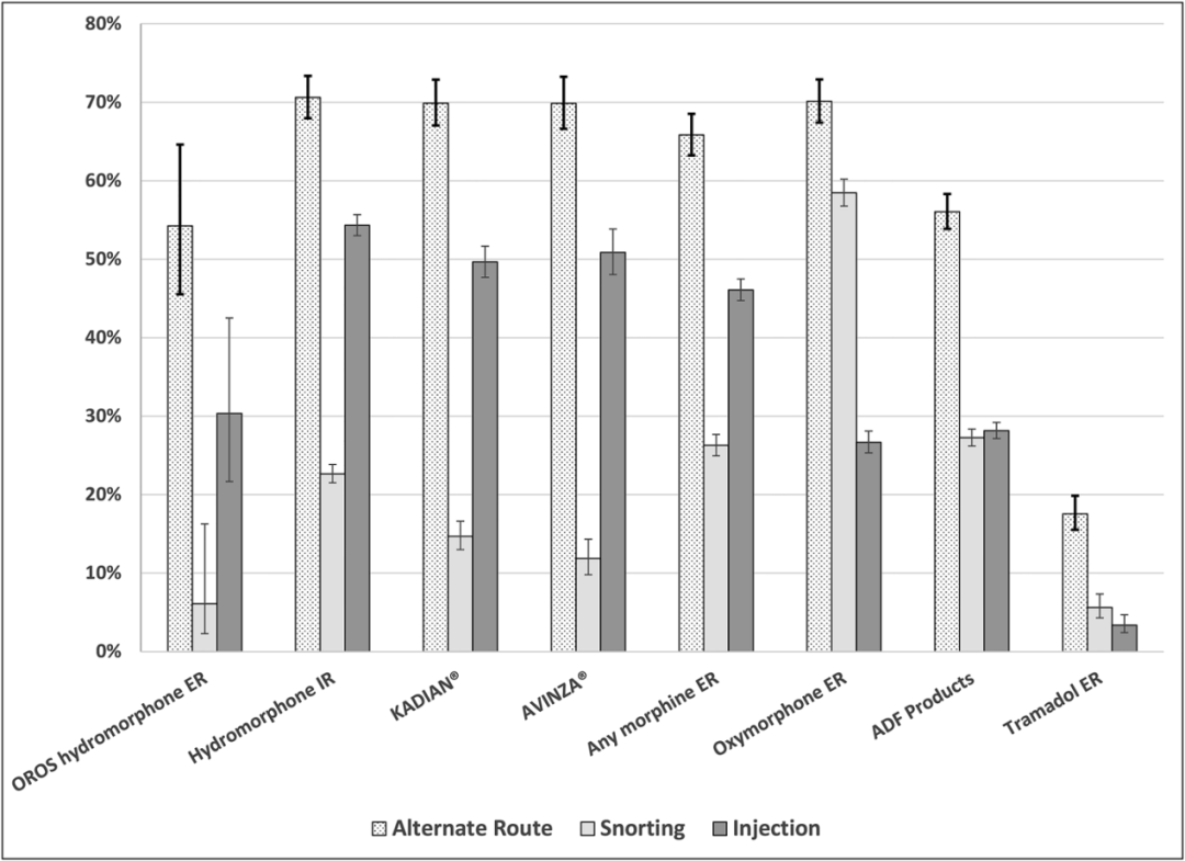 图4 OROS氢吗啡酮缓释片与其他阿片类药物在非口服途径(如咀嚼、直肠给药等)滥用比例的比较