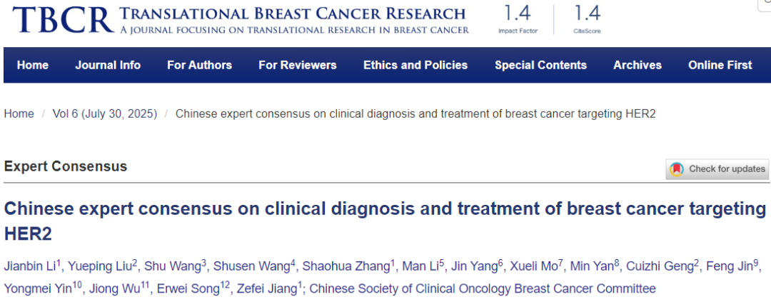 江泽飞教授:HER2诊疗共识最早是我们在2007年,在孙燕院士、沈镇宙教授的指导下完成第一版撰写的,随着HER2靶向药物从单抗到酪氨酸激酶抑制剂(TKI)再到抗体偶联药物(ADC),治疗范围也从HER2阳性到HER2低表达再到超低表达,共识名称从“HER2阳性诊疗共识”就变成了“靶向HER2诊疗共识”。自2023年制定上一版共识后,随着更多临床研究报告结果,我们今年就在专家组共同讨论下,由我和宋尔卫院士作为共同通讯作者撰写英文版诊疗共识,被《TBCR》(Translational Breast Cancer Research)杂志收录发表,标志着2025版诊疗共识正式发布。