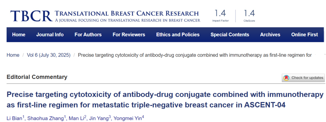 编者按:免疫治疗联合化疗是晚期三阴性乳腺癌(TNBC)的标准一线治疗方案,推动乳腺癌进入了免疫治疗时代。2025年6月在美国临床肿瘤学会(ASCO)年会上,ASCENT-04研究证实了在晚期TNBC一线治疗中,靶向Trop-2抗体药物偶联物(ADC)联合免疫检查点抑制剂的疗效优于传统化疗联合免疫治疗,成为全球首个TNBC领域ADC联合免疫治疗的Ⅲ期临床研究。该研究结果的披露引起了热烈反响,2025年7月30日,江苏省人民医院殷咏梅教授在《TBCR》(IF=1.4)发表了针对该研究的评论文章,对ADC联合免疫治疗在TNBC应用的优势人群、用药时机、维持治疗等相关探索进行了深入讨论,并对在中国人群应用ADC联合免疫治疗的ASCENT-C04研究充满期待。