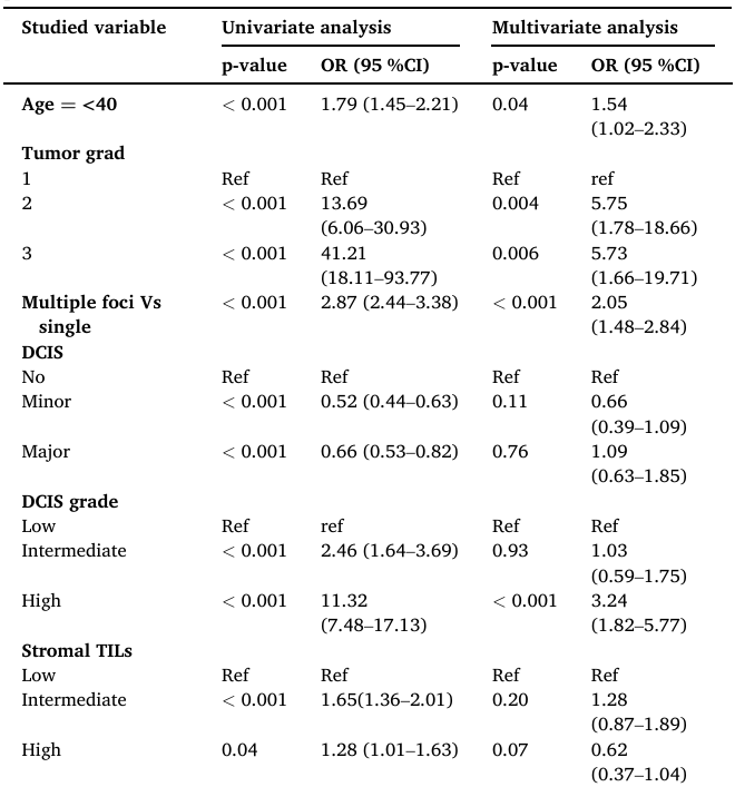 Logistic回归分析确定了几种与HER2阳性风险增加独立相关的侵袭性肿瘤特征。这些特征包括年龄≤40岁(P=0.04)、肿瘤分级较高(3级)(显著P值为0.006)、DCIS分级较高(P<0.001)、乳腺内存在多个病灶(P<0.001)以及N3分期(P<0.001)。