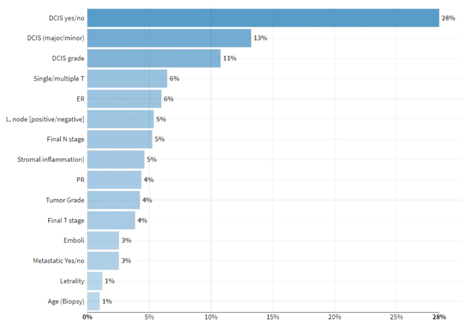 DCIS的存在、DCIS成分(主要成分vs.次要成分)的百分比、DCIS分级、肿瘤多发以及ER状态是预测HER2状态的四大重要变量。对于该数据集,受试者工作特征曲线下面积(AUC)得分为0.95。