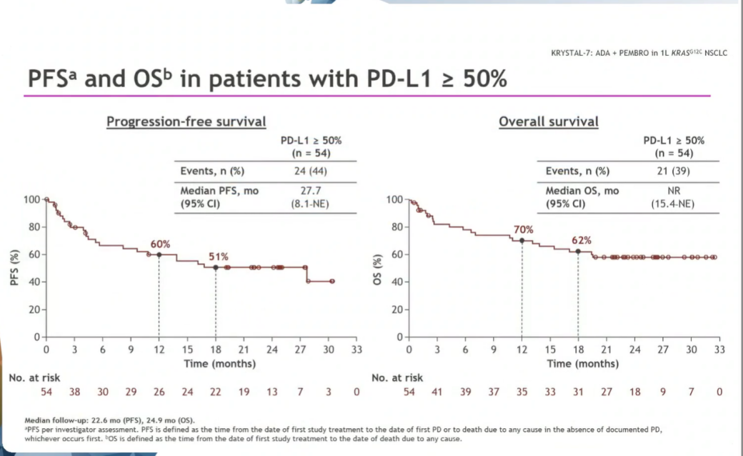 1、与免疫检查点抑制剂联合。以adagrasib联合帕博利珠单抗为代表的KRYSTAL-7研究。研究共入组149例患者,脑转移患者占比为16%,入组患者接受adagrasib 400mg,口服,每日两次的治疗联合标准剂量的帕博利珠单抗。今年ELCC会上公布了该研究中,PD-L1≥50%的患者数据,这部分患者的ORR为59%,中位DoR为26.3个月,中位PFS为27.7个月,中位OS未达到,但这种组合也带来了明确的毒性,尤其是肝功能损伤,该队列中,3级以上不良反应发生率为58%,3级及以上谷丙转氨酶和谷草转氨酶升高的比例分别为11%和13%。2025年ASCO年会上,研究者公布了完整数据,整体人群中,分别有26%、18%和26%的患者PD-L1<1%、1-49%和≥50%,整体人群的ORR为44%,PD-L1<1%、1-49%和≥50%的患者的ORR分别为36%、41%和61%,中位PFS和中位OS分别为11.0个月和18.3个月,PD-L1<1%、1-49%和≥50%的患者的PFS分别为8.2个月、13.5个月和27.7个月,整体3度及以上不良反应的发生率为59%。